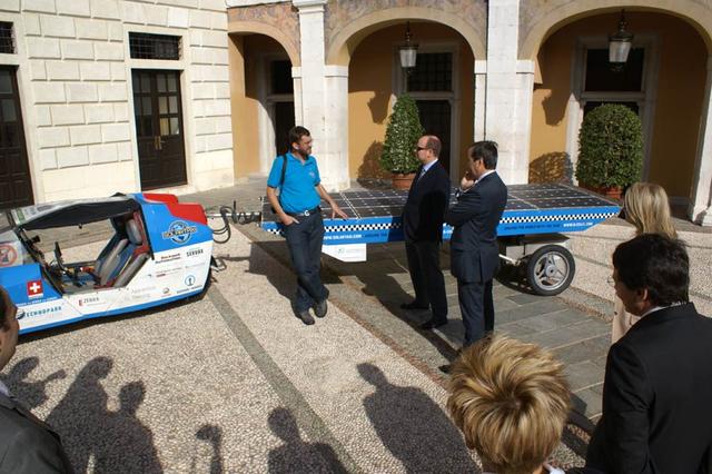 Then the Police escorted us to the Palace, where we had the honour to meet Prince Albert. He is very interested in questions related to climate change, and so he liked the idea of educating people about new technology with a project like this one. The Prince drove the solartaxi around in his courtyard and it was a great discussion.
